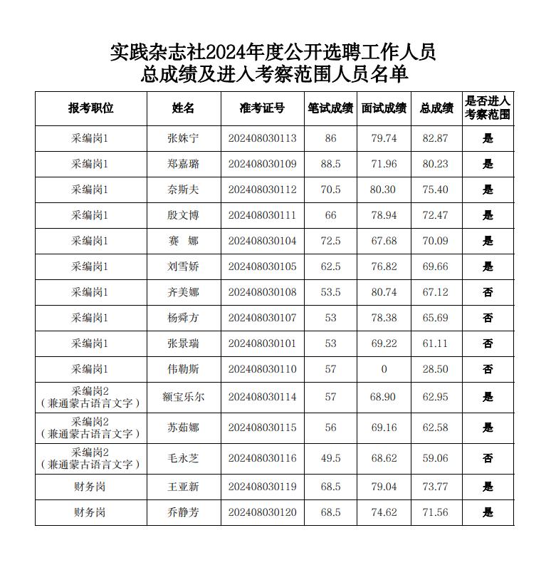 关于对实践杂志社2024年度公开选聘工作人员 总成绩及进入考察范围人员名单的公告