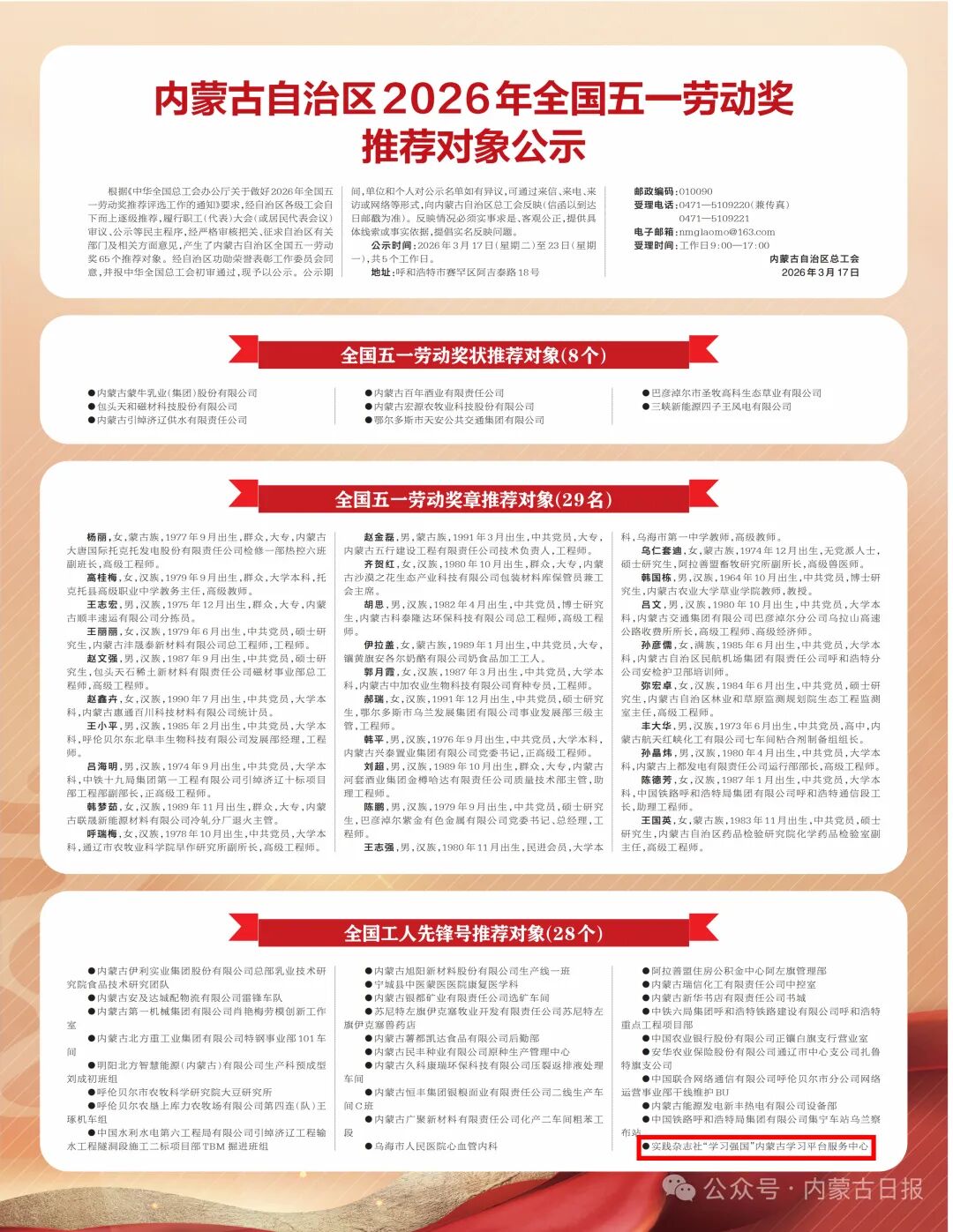 内蒙古自治区2026年全国五一劳动奖推荐对象公示 实践杂志社“学习强国”内蒙古学习平台服务中心入围