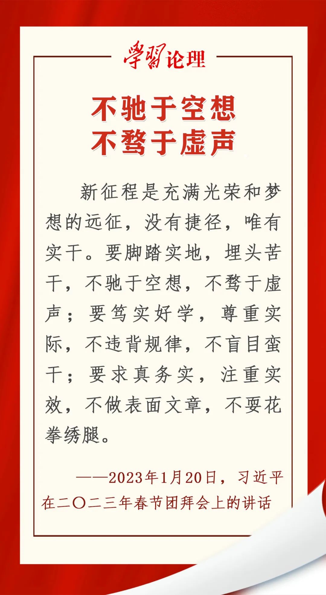 全面建设社会主义现代化强国的重任,靠什么完成?中华民族伟大复兴的梦想,靠什么实现?新征程是充满光荣和梦想的远征,没有捷径,唯有实干。“不驰于空想,不骛于虚声。”在2023年春节团拜会上,习近平总书记以李大钊的这句名言,昭示了共产党人求真务实的精神、奋发有为的姿态,确立了苦干实干的主旋律、主基调。