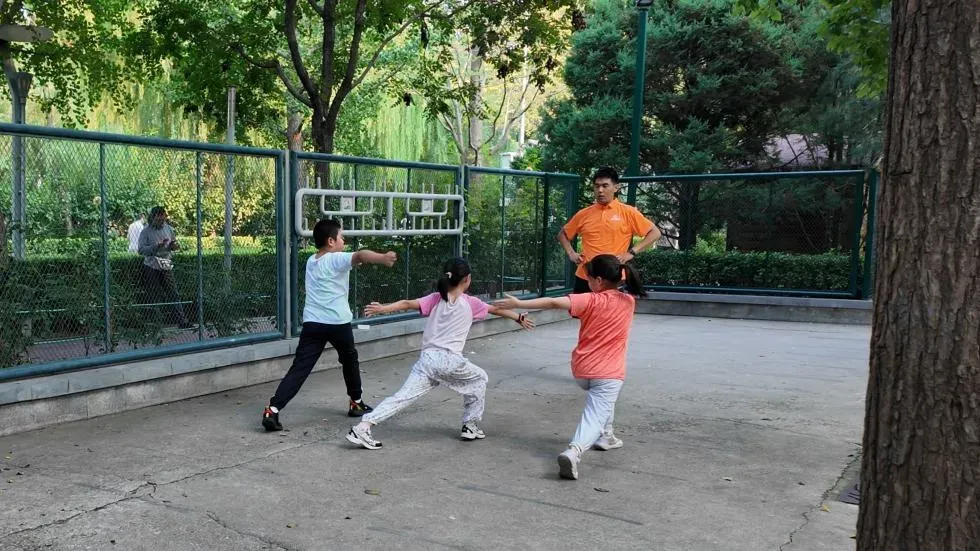 职业体能教练正在“外卖体育”课上指导学生动作。图片来源:央视网记者 摄
