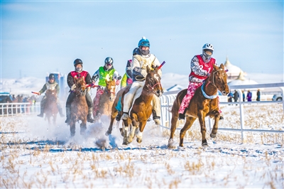 1月18日,锡林浩特市那达慕风情园内马蹄踏雪、人声鼎沸,“歌游内蒙古·畅享锡林浩特”——冬季那达慕暨蒙古马超级联赛在欢腾的歌声中拉开序幕。开幕式上,随着马蹄的哒哒声,一支雄壮的马队踏雪而来,骑手们身着艳丽的蒙古袍,驾驭着矫健的蒙古马,以整齐的队列自远处缓缓走来。歌声悠扬,舞姿豪迈,演员们以动人的演绎,完美诠释了力量与艺术之美。本次赛事包含15公里耐力赛、10公里3人团体接力赛、跑马射箭、跑马拾哈达、6公里走马及搏克比赛等比赛项目。赛场上,骑手们驭马飞驰,人与马默契配合,在银装素裹的雪原上纵横驰骋。在跑马射箭与跑马拾哈达项目上,骑手在飞奔的马匹上挽弓搭箭、俯身拾物,动作行云流水,精湛技艺引来观众阵阵惊呼与赞叹。除了扣人心弦的比赛,本次活动还为游客打造了丰富的冰雪互动体验。冰雪涮肉宴香气四溢,草原篝火电音派对将热情推向高潮,千人雪战、雪地拔河等趣味项目让游客亲身参与,尽情享受冰雪乐趣。现场还同步举办了锡林浩特“伊德喜”草原冬储肉展销活动,让游客在观赛之余,还能选购到正宗锡林郭勒牛羊肉,体验纯正的草原风味。