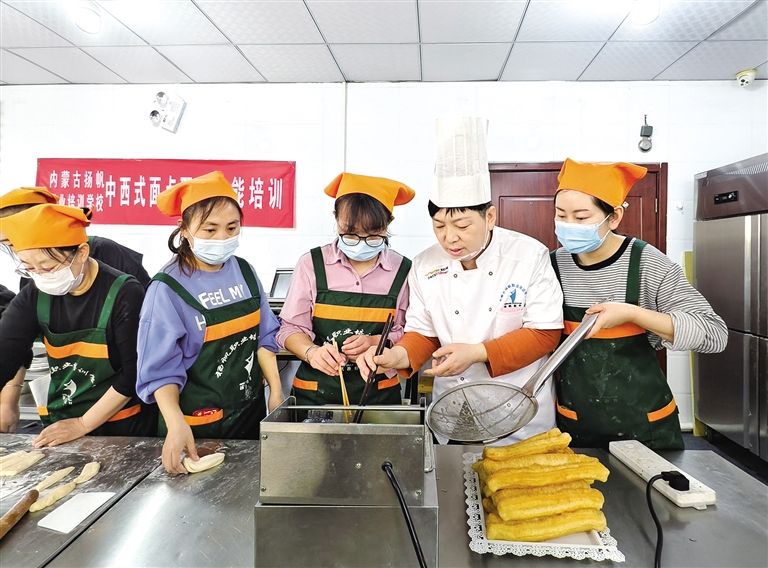 3月24日,在内蒙古扬帆职业培训学校,学员们正在进行面点制作技能培训。今年,呼和浩特市实施“乐业青城”十项行动计划,同时围绕本地优势特色产业和市场急需紧缺人员需求,开展补贴性技能培训,帮助劳动者实现“家门口学技能、凭技能好就业”的心愿。草原云·内蒙古新闻网记者 杨林枝 摄