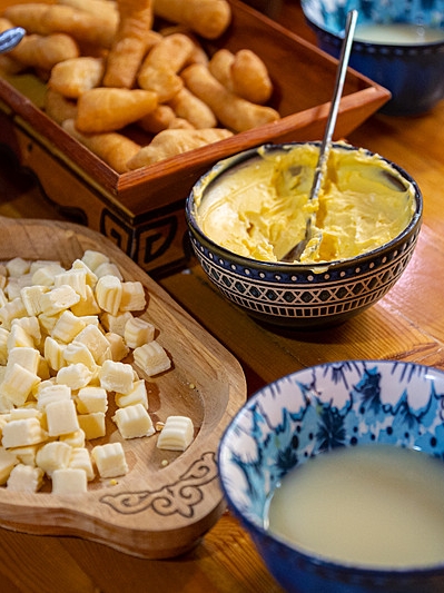 奶皮子如同草原上的“黄金薄膜”,慢火煮奶过程中揭取的表层油脂凝结物,每公斤牛奶只能出一两,被称为“百食之长”;奶豆腐则是将酸奶浓缩去水分后形成的块状物,便于携带和长期保存,能在行囊里躺上数月不坏;而稀奶油主要通过静置或离心分离全脂奶,收集上浮脂肪层制成;黄油则通过持续搅打发酵奶分离出不同脂肪成分制成。这些白食不仅美味,还富含营养,体现了游牧民族“药食同源”的生活智慧。