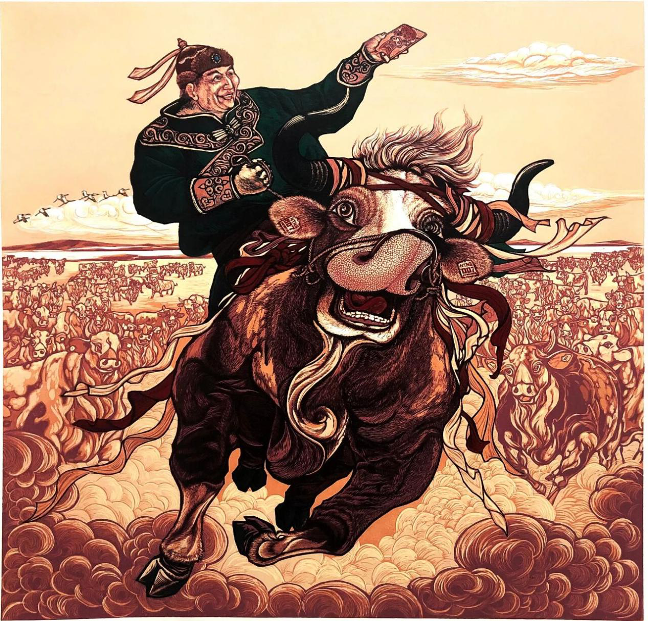 牛的文化符号从传统走向现代。阴山岩画中凿刻的牛,是原始先民对力量的崇拜;英雄史诗《江格尔》里描绘的牛,是勇士不屈不挠精神的化身;而在今天的文创产品与城市雕塑中,牛的形象有的憨厚可爱、有的威武大方、有的代表着接地气的“奋斗者”,这种形象的变化不断连接起大众情感与地域认同,完成着从传统到现代的精彩转化。