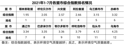 2021年1-7月,全区环境空气质量平均优良天数比例为85.2%,同比下降1.9个百分点;沙尘天气影响导致的超标天数占总超标天数的68.1%,同比上升42.0个百分点。12个盟市优良天数比例由高至低依次为:呼伦贝尔市99.5%、兴安盟96.7%、锡林郭勒盟94.3%、赤峰市92.0%、乌兰察布市88.7%、呼和浩特市83.5%、通辽市83.0%、鄂尔多斯市79.2%、阿拉善盟78.8%、包头市77.8%、巴彦淖尔市76.9%和乌海市71.7%。